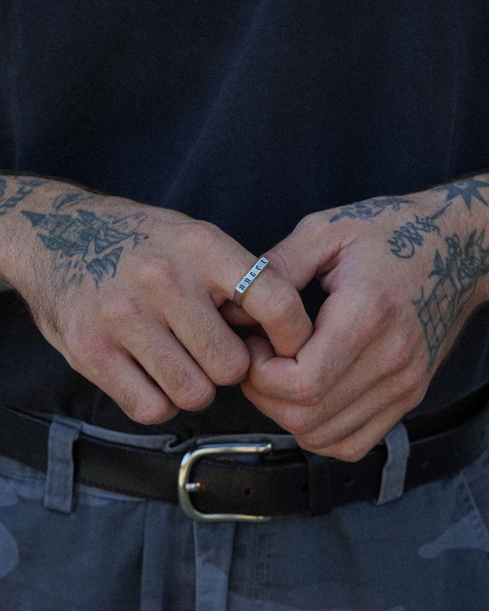 Dark Side Of The Moon Signet Ring features a 12mm x 12mm face set with a 10mm moonface engraved onyx stone, encased with cloudy, starry night engravings. Inside, the ring is engraved with: 'We must go through phases of emptiness to feel full again'. Cast in 925 sterling silver.